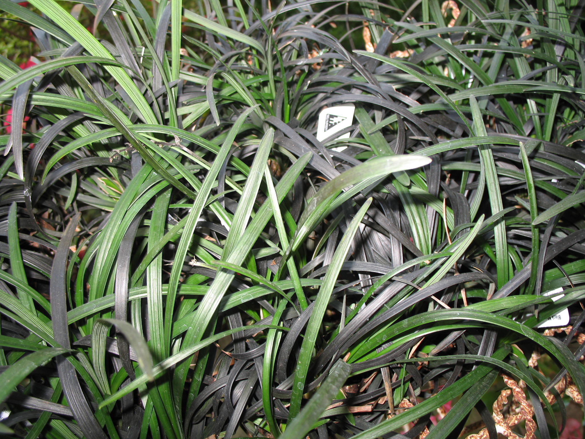 Foliage is dark purple, but appears to be black in most light situations in the garden. This selection is more of a specimen plant than are other mondos. Dark foliage provides excellent contrast with lighter foliaged plants. It is used as a border and as a ground cover. It is also listed as Ophiopogon planiscapus 'Nigrescens'.
